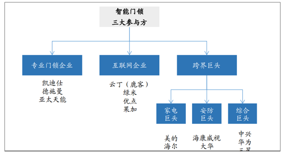 諸多市場(chǎng)參與者進(jìn)入智能門鎖市場(chǎng)中。主要可分為六大類,其中: